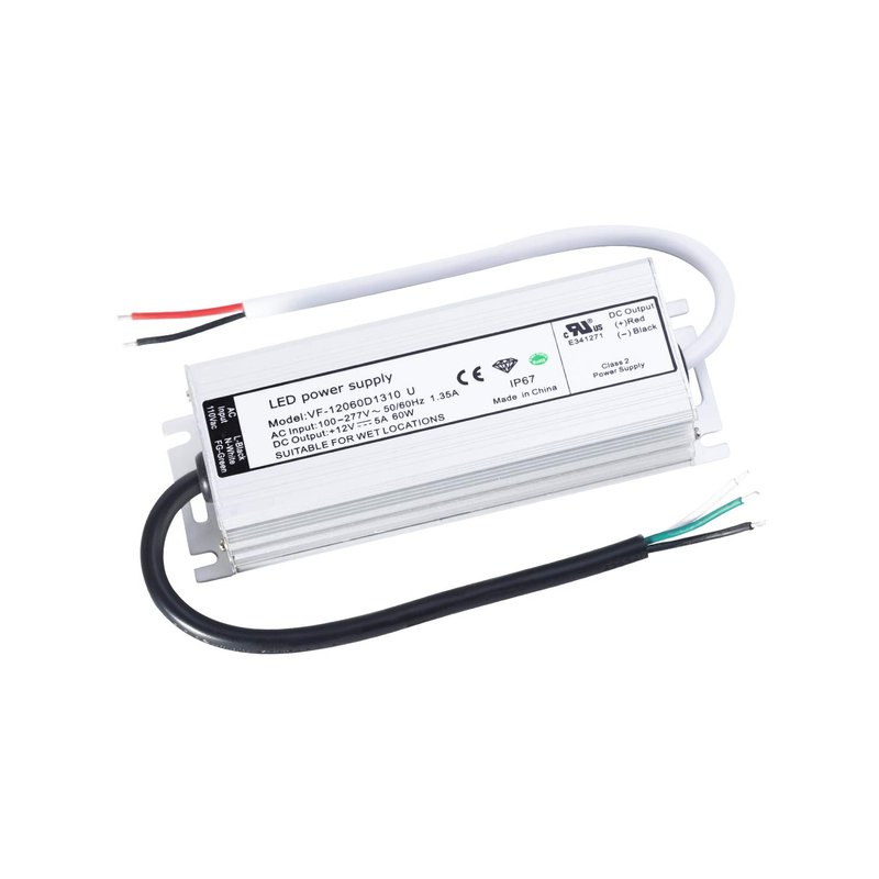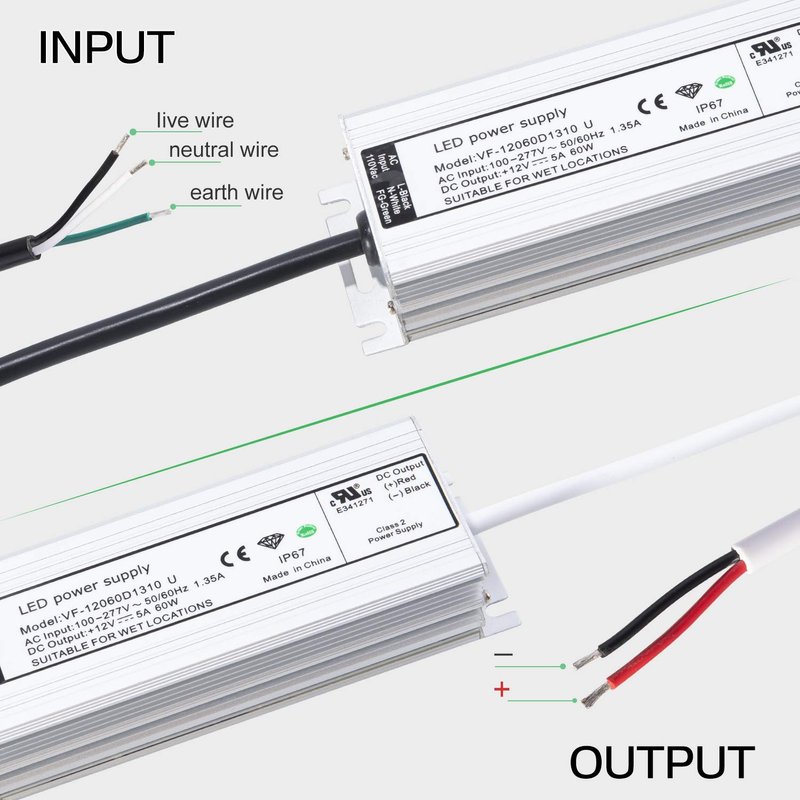 - Constant Voltage LED Driver:Input: 100-277V AC 50/60HZ. Output: 12V DC 5A 60W.CLASS 2,Low ripple, Low noise.NOT dimmable, only compatible with RGB dimmers