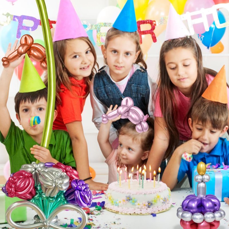 - Small kits inspire great wisdom: animal balloons for twisting can stimulate children's thinking and creativity, They can coordinate the development of hands and eyes. Bright assorted balloons can create novel magic effects and fold out a variety of peculiar shapes,they look like the magic of dawning. The metallic long balloons multicolor can help children organize more gatherings parties, so that children can make friends widely, It helps children form a good personality.