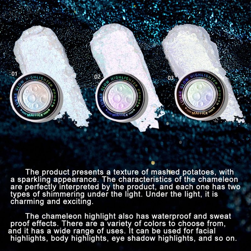 - - Achieve a glowing look with Planet Highlighter that features a unique potato mud texture. The shimmering exterior sparkles with two different lights under any lighting. Enjoy the versatility of this waterproof and sweat-resistant highlighter available in multiple colors – perfect for face, body, or eye highlighting.
