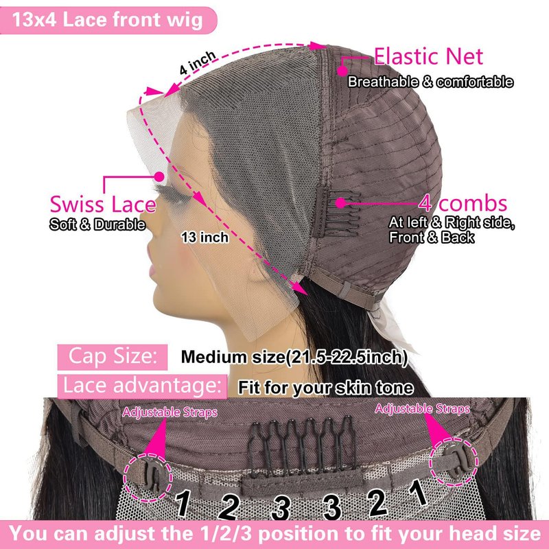 Bob Straight Wig Lace and Cap Size: 13x4 Ear to Ear HD Transparent Swiss Lace, Full Looking Natural and More Comfortable. 22.5 Inch Medium Cap with Adjustable Strap (19.5inch-22.5inch adjustable range) and 4 Combs.
