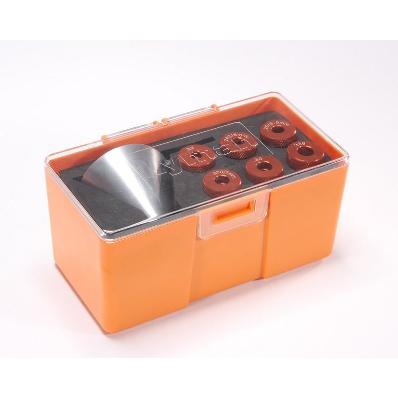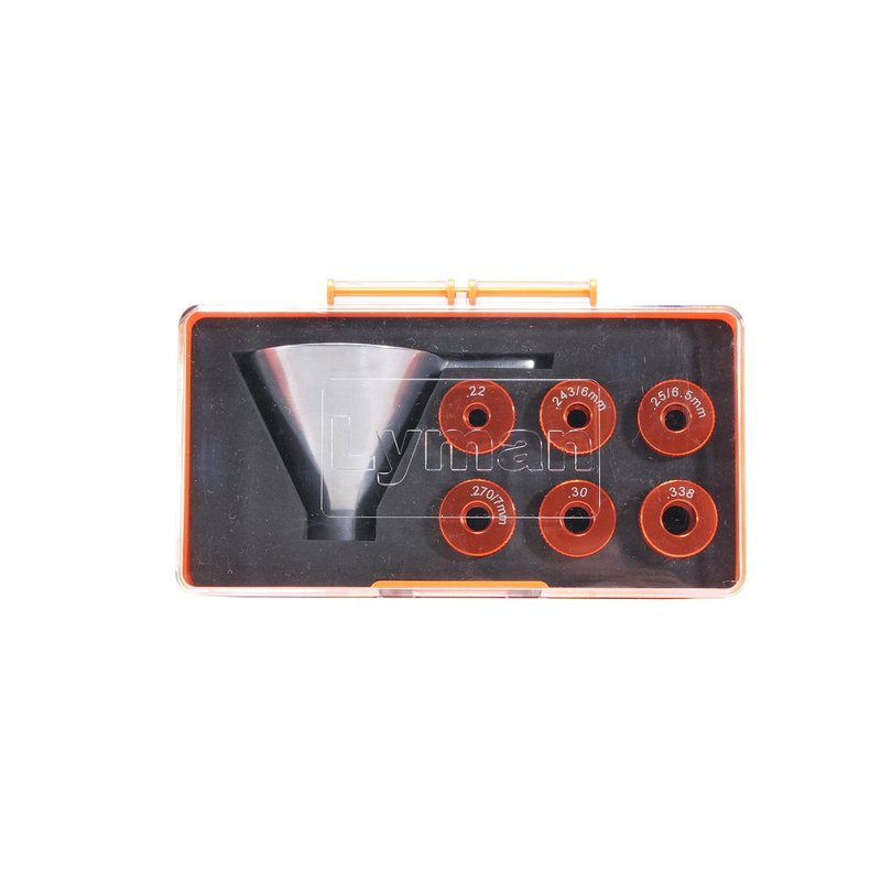 - The funnel Comes with inserts for 22, 243/6mm, 25/6.5mm, 270/7mm, 30 and 338 caliber rifle cartridges