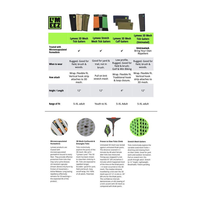 - LYMEEZ STRETCH MESH TICK GAITERS confound and repel ticks. Ticks don’t fly or jump! Most ticks climb on from grass and leaf litter—stop them on their climb. Ticks instinctively explore the variable-sized mesh holes—diverting and slowing them on their climb—exposing them to repellent for longer. Use in conjunction with other repellents on other body areas.
