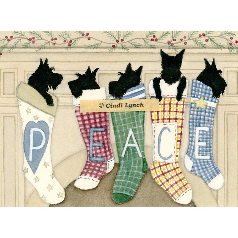 Lynch 12 Christmas cards: Scottish terriers (scotties) hung by the chimney with care folk art