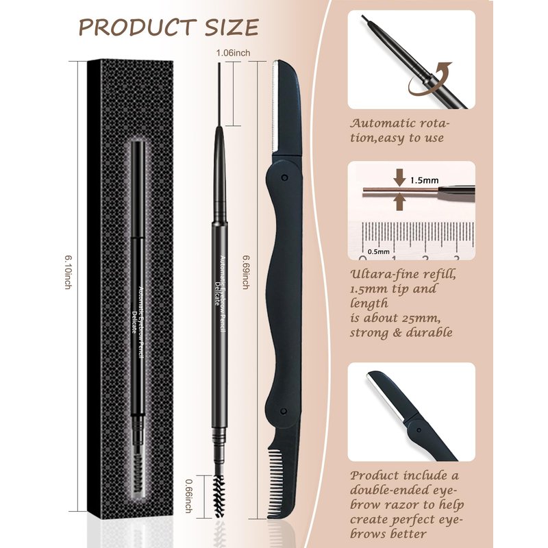 - ULTRA FINE DUAL-ENDED EYEBROW PENCIL - The product includes 4Pcs eyebrow pencil and dual-ended brow razor, they are five classical Pop colors available, 360 Degree rotation design, retractable eyebrow pencil body, adopt waterproof ultra-fine mechanical pencil refill, goes on smoothly, the color can stay all day long.