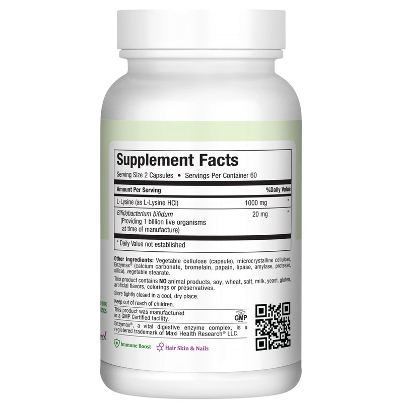 - AMINO ACID WITH PROBIOTIC - Enhance your wellness journey with our L-Lysine 1000 mg capsules. Our unique complex unites the benefits of 1000mg lysine, an essential amino acid and protein building block, with the power of probiotics (Bifidobacterium bifido).