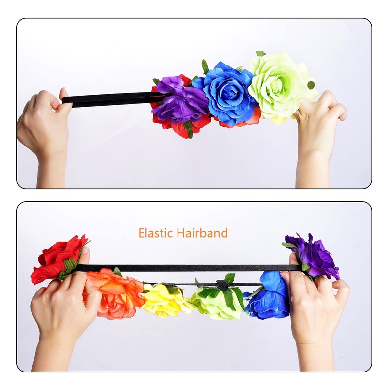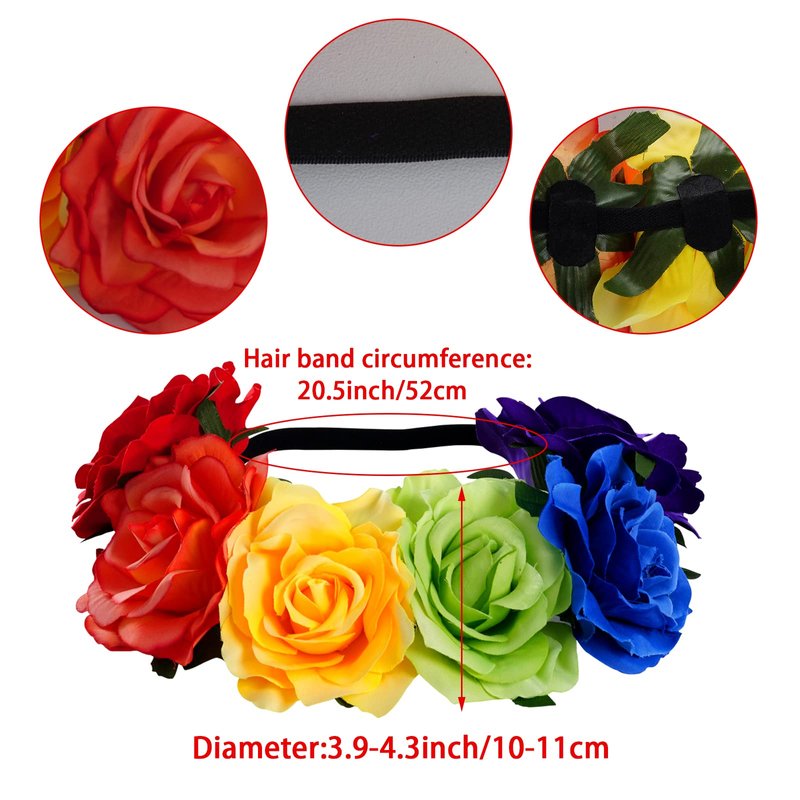 - Quality Material: The Rainbow Rose Crown is made of polyester fabric and black elastic band with green ivy leaf trim, looks vivid and prrety. Package Included:1x Hair Garland.