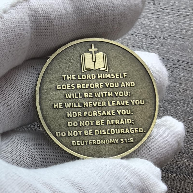 - Inspirational Reverse Design: On the reverse side, the coin is adorned with an embossed scripture from Deuteronomy 31:8 - "The Lord himself goes before you and will be with you; He will never leave you nor forsake you. Do not be afraid; do not be discouraged"