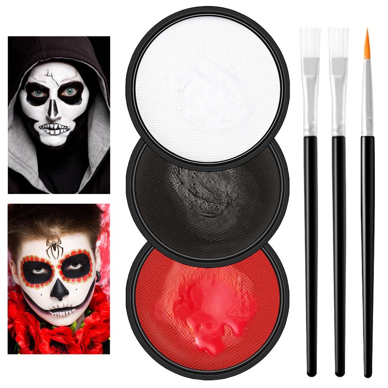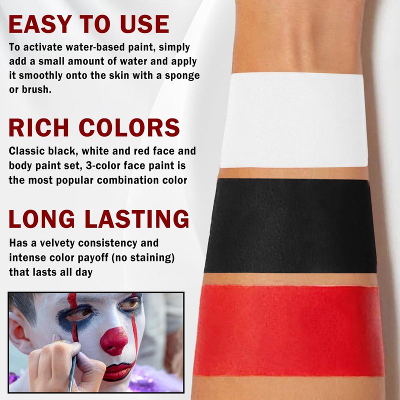 Clown makeup kit,water based face paint kit includes red black and white face painting and 3 professional brushes.Flat brush can meet your needs for large-area painting and full coverage,and thin liner brush can be used for line and detail painting.1.High quality,face paint is brightly colored and has strong makeup holding power.It can be applied with other colors,providing excellent full coverage for facial and body painting,and providing you with a high-color clown makeup.2.Safe ingredients,clown makeup kit adopts a healthy and safe,natural and gentle formula,with a light and docile makeup feel,suitable for all skin types.Not tested on animals,vegan and cruelty-free.3.Easy to apply and remove,just add a small amount of water to activate the natural pigment,or dip the brush in water and mix it with the pigment,and it can be easily applied to the skin.After use,wipe it with water or wet wipes to easily remove it