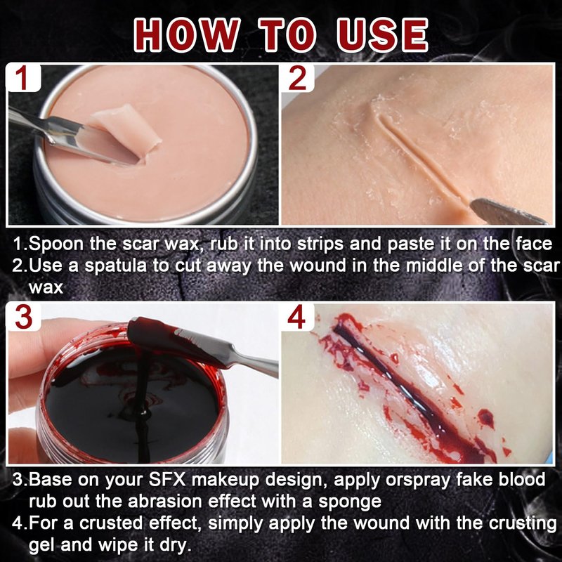 - 【Special Effects Makeup Kit】The kit includes scar wax,coagulated blood,red black and white face painting,stippling sponge and spatula.One kit can meet your makeup needs for creating realistic wounds