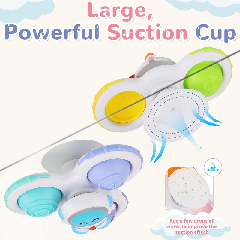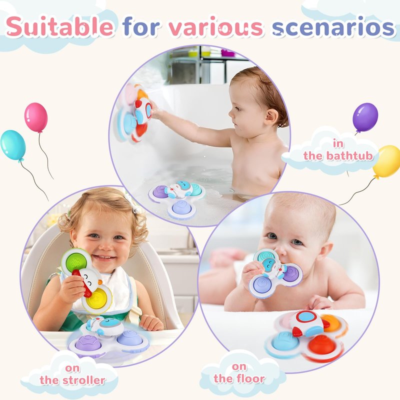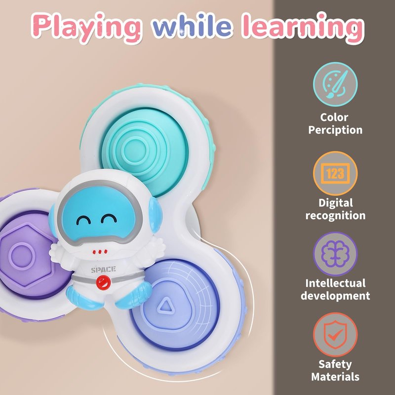 - The baby spinning toy includes 3 cute cartoon shapes of rockets, spaceships and astronauts, with bright colors and smooth bearings that rotate durably by simply pushing them gently with your fingers. Very easy to attract the attention of young children and relieve the baby's restlessness.