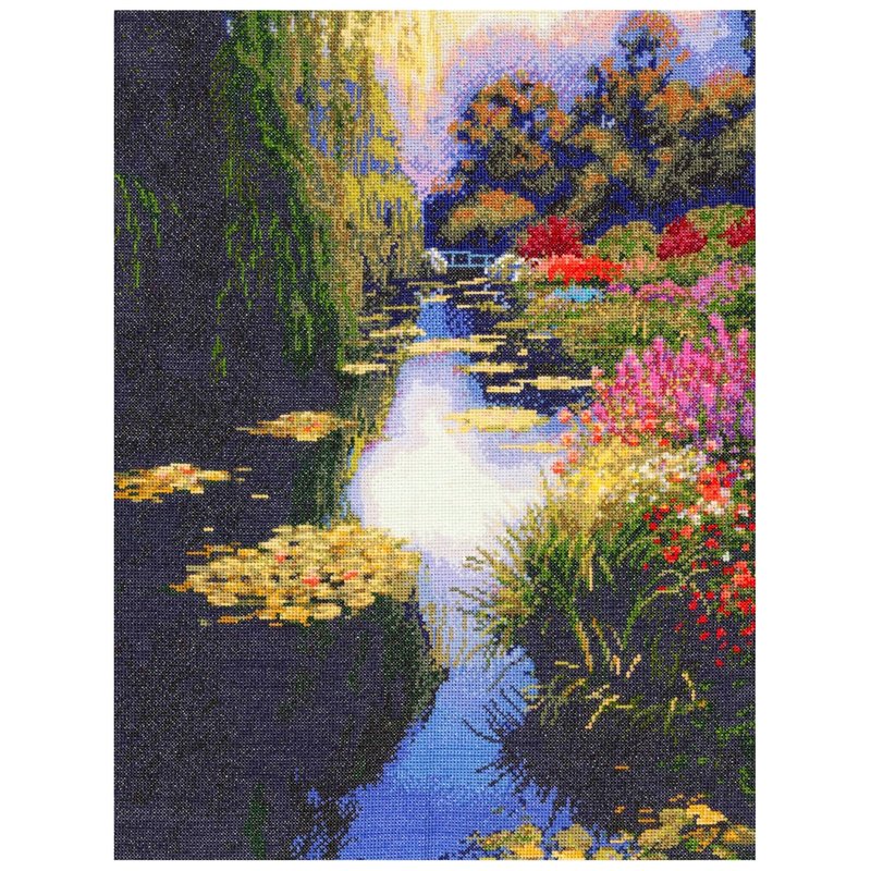 MCG TEXTILES-Candamar Design: Gold Collection Counted Cross Stitch Kit. This kit contains 100% cotton 16 count ivory Aida, presorted cotton floss, needle, chart, and easy to follow instructions. Finished size: 12x16in. Design: View from Monet's Bridge. Made in USA.