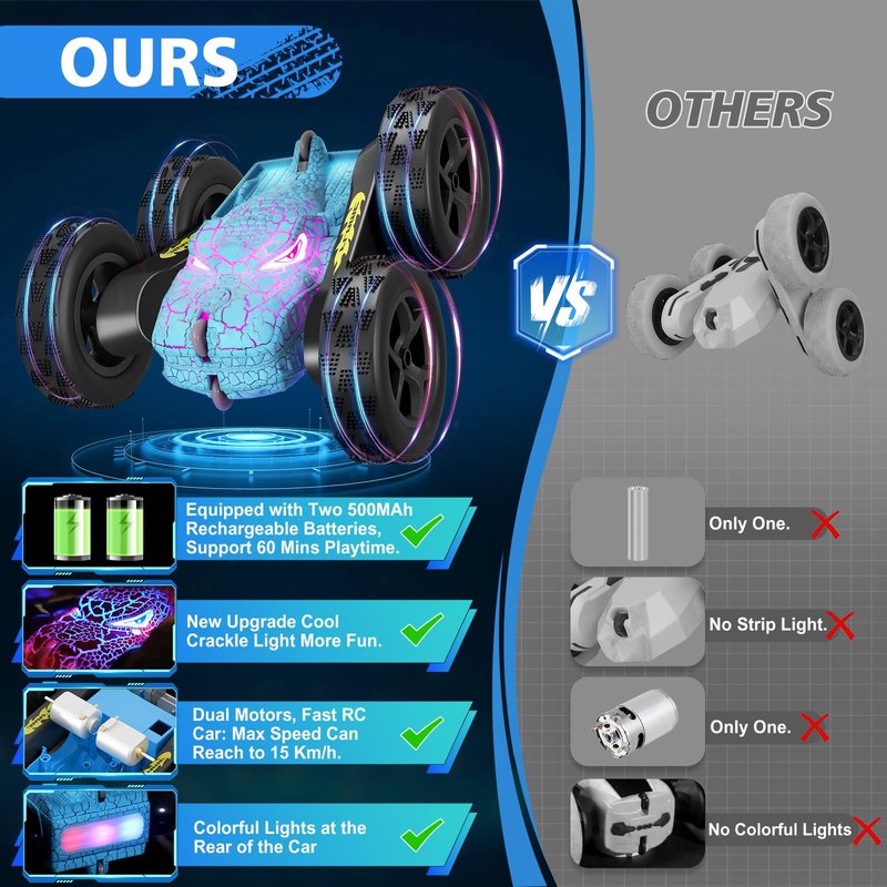 - 2 RECHARGEABLE BATTERIES & DUAL MOTORS - The kids remote control car equipped with 2 500MAh rechargeable batteries ,2 AA batteries (for controller),battery of outdoor dinosaur rc cars is detachable,more portable to recharge and play! Each battery of rc cars supports 30mins playtime after fully charged,double reach to 60mins! Dual motors make rc stunt car's speed faster than others,max speed can reach 15km/h.