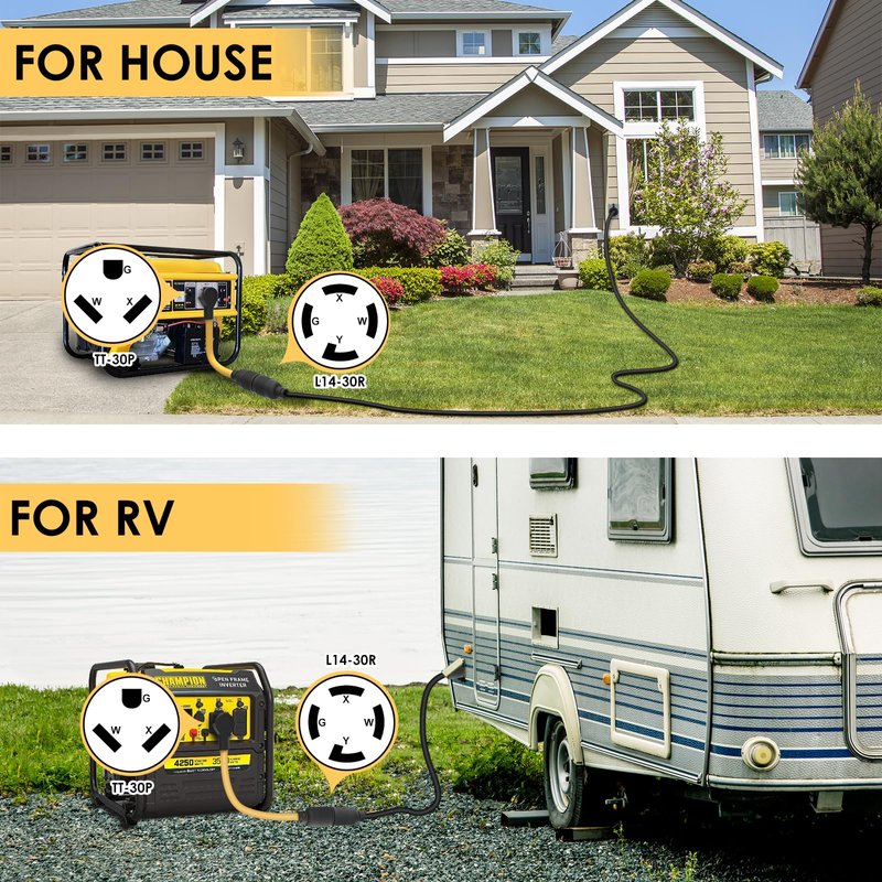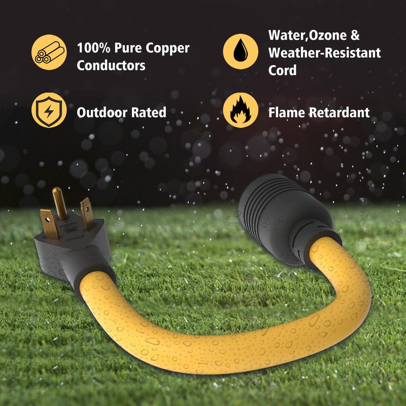 - [Cord Rating] 3 prong NEMA TT-30 plug to L14-30 generator locking outlet connector. 1.5 Feet 10 gauge, Rated for 125V max rate 3750 watts. UL Listed.