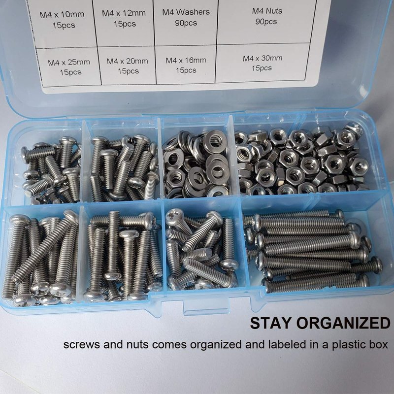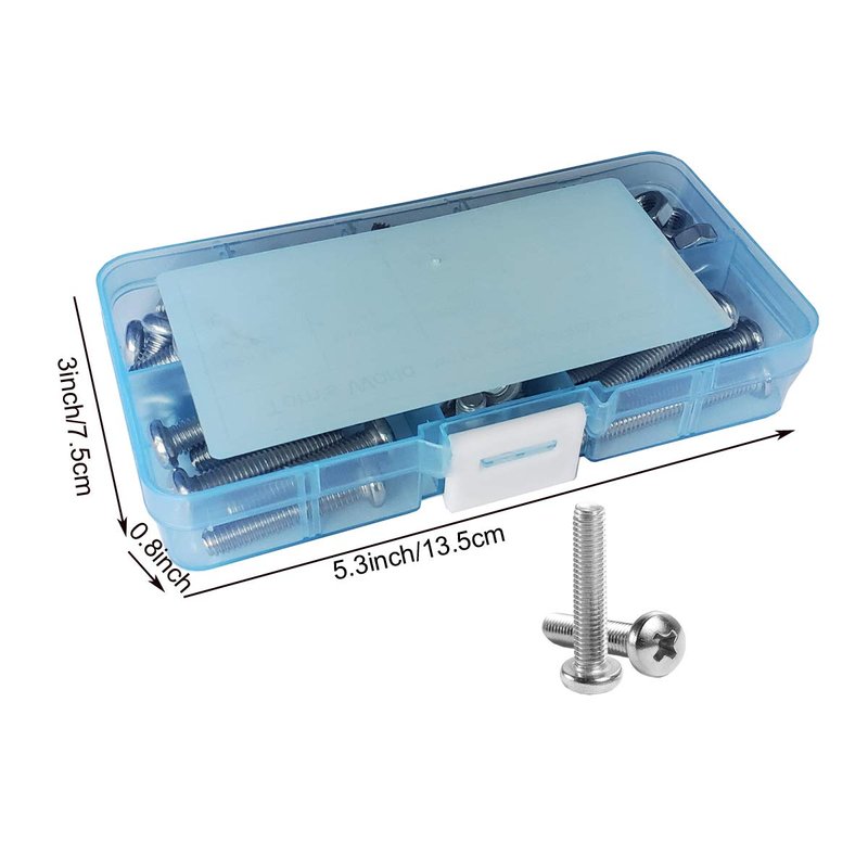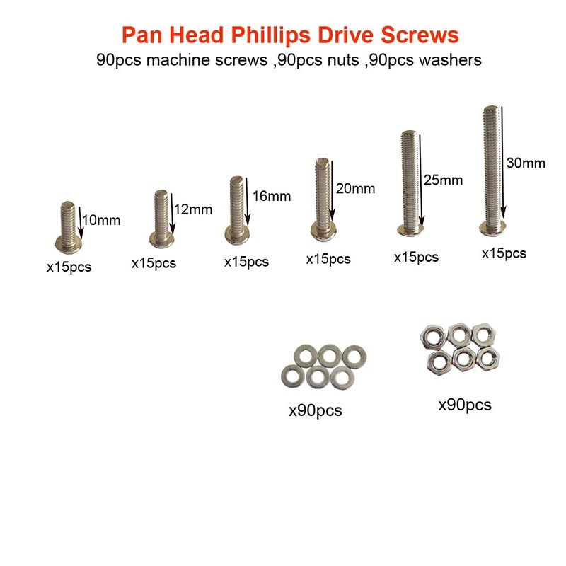 - Package include: This m4 pan head screws kit includes 10mm/12mm/16mm/20mm/25mm/30mm ,each includes 15 pcs,m4 stainless steel nuts 90pcs and m4 flat washers 90pcs. Thread Pitch: 0.7mm,phillips drive. Metric machine screws for TV computer LCD Monitor mounting.
