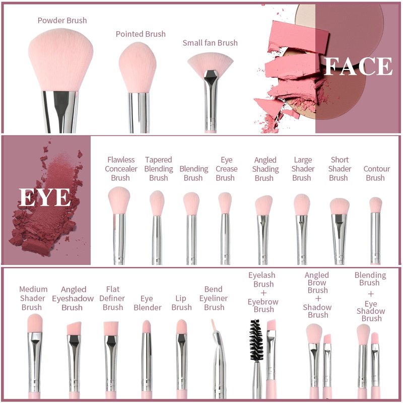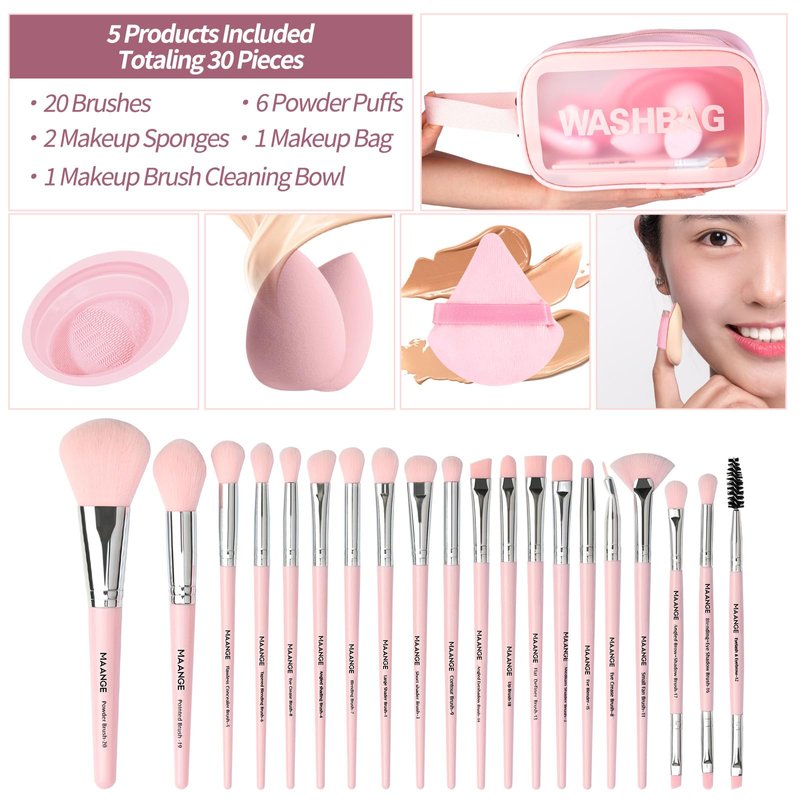 MAANGE 30-Piece Complete Make Up Brush Set 5 Products Included for Powder Foundation Eyeshadow Concealer Eyeshadow Pink