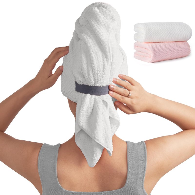 MABAO 2 Pack Microfiber Hair Towel Wrap for Women, Quick Dry Hair Turban Towel with Elastic Band, Microfiber Plopping Towel for Curly Hair, Long & Thick Hair 26.3" X 40"(Pink, White)