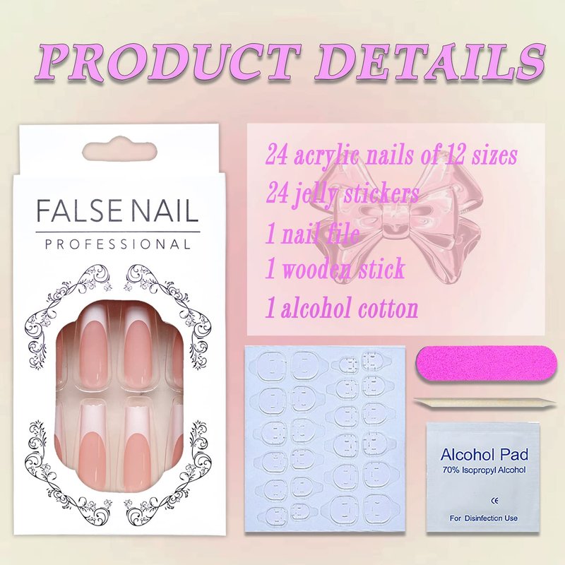 - 【Package Content】You will get 24 acrylic nails of 12 sizes, 1 nail file, 24 jelly stickers, and 1 wooden stick for removing false nails.