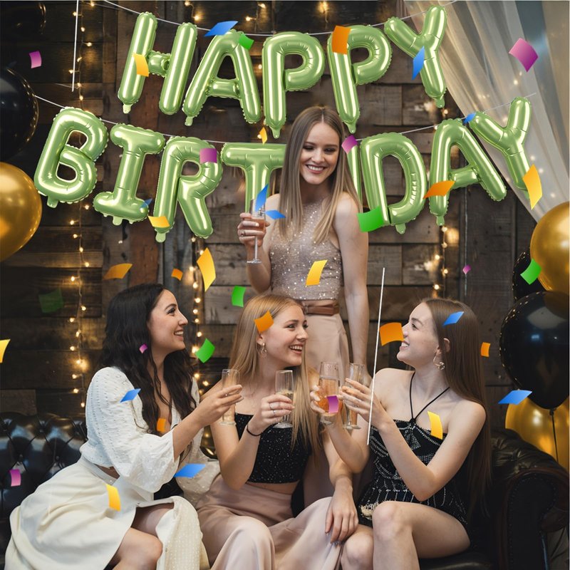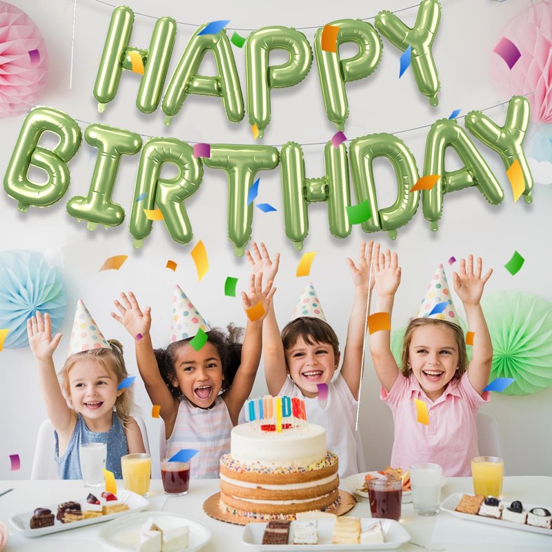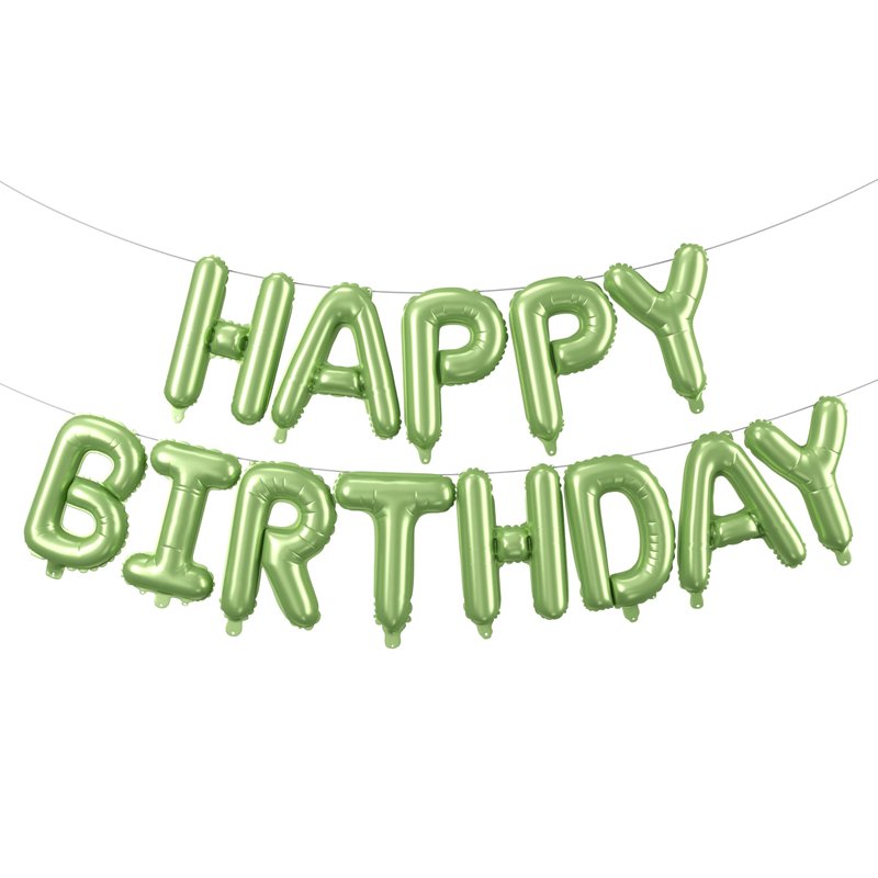- Macaron Green Happy Birthday Balloon Banner Set:16 inch green happy birthday balloons.Each package come with 13 pcs independent letter balloons which can be combined into "HAPPY BIRTHDAY",1 pcs straw and 1 white ribbons 10 meters long.Create a memorable atmosphere with this versatile and stylish birthday balloon kit.