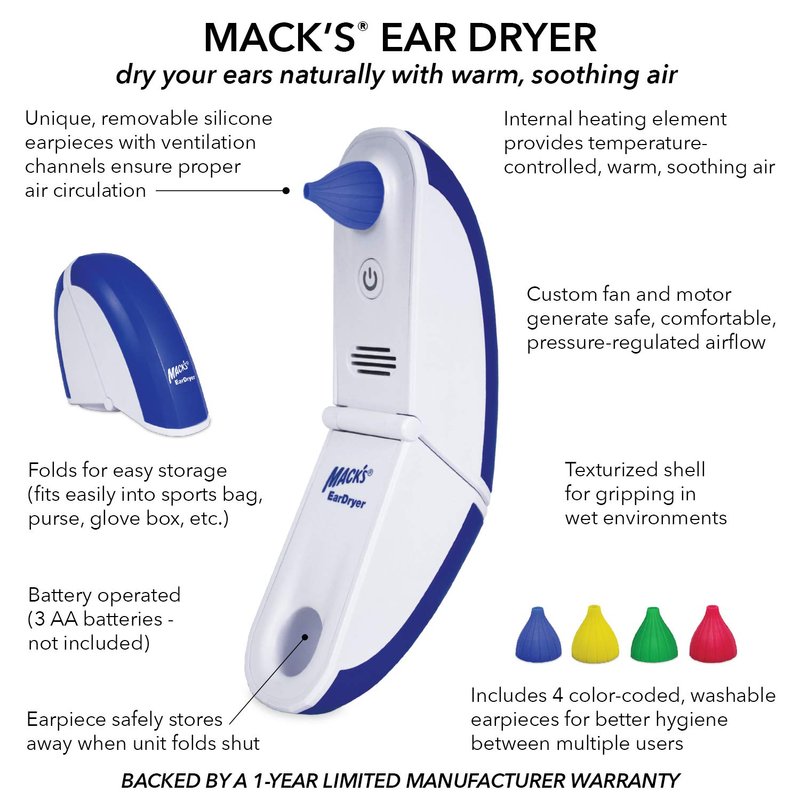- DOCTOR RECOMMENDED - Ear, nose and throat doctors around the world recommend Mack's Ear Dryer for use after swimming, bathing, water sports, scuba, hearing aid use, etc. No more uncomfortable, water clogged ears. Backed by a 1-Year Limited Manufacturer Warranty.