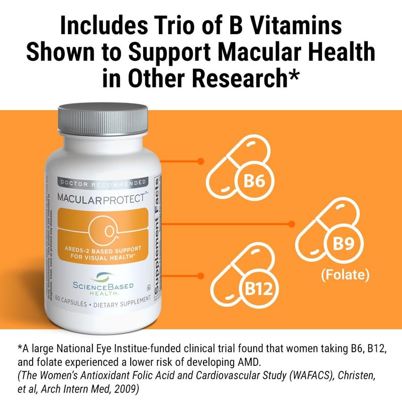 - EXTRA MACULAR HEALTH SUPPORT WITH B-VITAMINS: Includes a trio of key B-vitamins—B6, B12, and folate—shown in additional research to help promote long-term vision wellness.