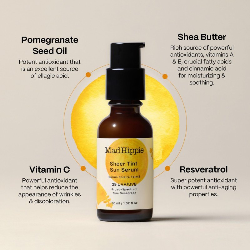 Mad Hippie Sheer Tint Sun Serum is a lightly tinted zinc oxide sunscreen that leaves a clean, effortless glow after application with SPF 29 protection from the sun’s most harmful rays.