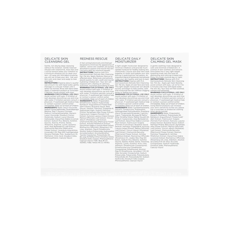 Experience gentle yet effective skincare with our Discover Delicate Care Kit, designed to soothe, calm, and moisturize sensitive skin, featuring a comprehensive collection of products including the Delicate Skin Cleansing Gel, which gently cleanses without irritation, the Delicate Daily Moisturizer, which provides essential hydration, the Redness Rescue gel, which calms and hydrates irritated skin, and the Delicate Skin Calming Gel Mask, which offers a soothing treatment to reduce discomfort and promote a balanced complexion.