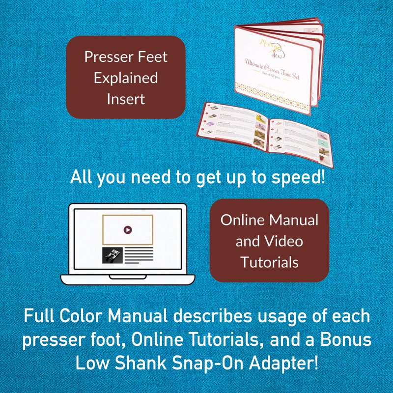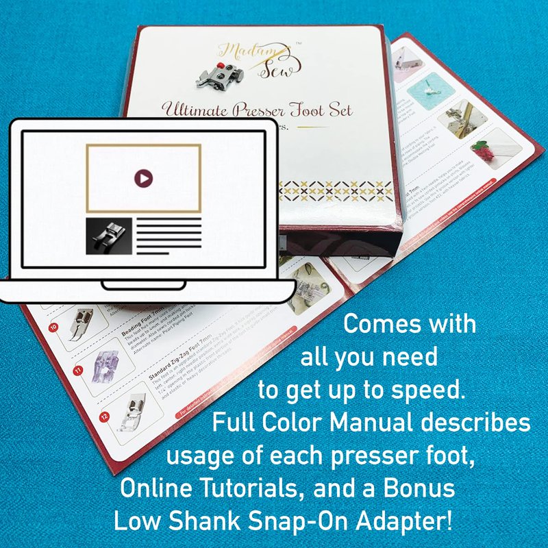 - SNAP-ON INSTALLATION- Is quick, easy to use, and hassle-free. Every Madam Sew Presser Feet Kit includes digital and printed full-color manuals that identify each presser foot and its uses. You will learn how to get the most out of every presser foot with our helpful manuals.