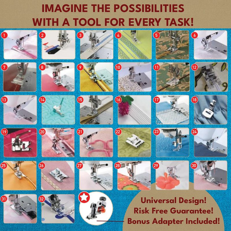 - GREAT TO HAVE, GREAT TO GIFT - As seen in Threads Magazine Gift Guide. This 32-piece sewing machine presser foot kit puts all the popular presser feet at your disposal. Compatible with Singer, Brother, Janome, Husqvarna, Viking, and Kenmore sewing machines, their superior design and top-quality construction ensure long-lasting durability. Bonus low shank adapter included.