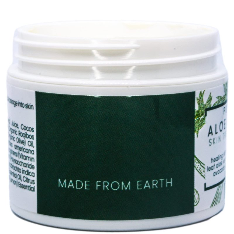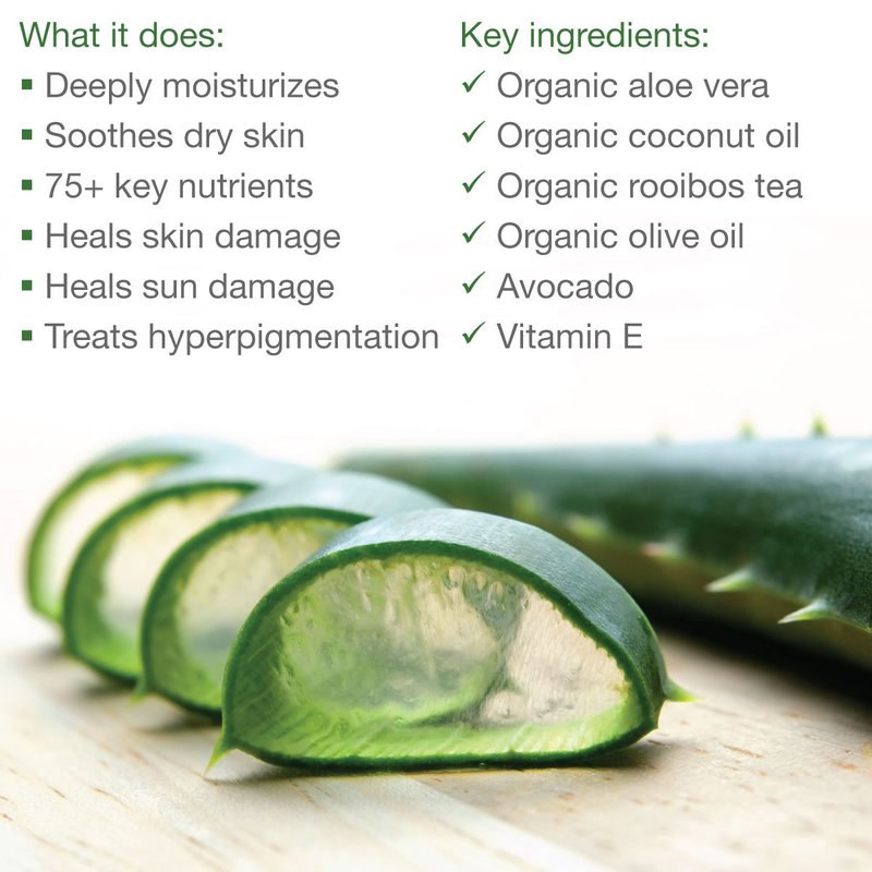 - Natural organically grown aloe vera with rooibos tea, olive oil, avocado & Vitamin E