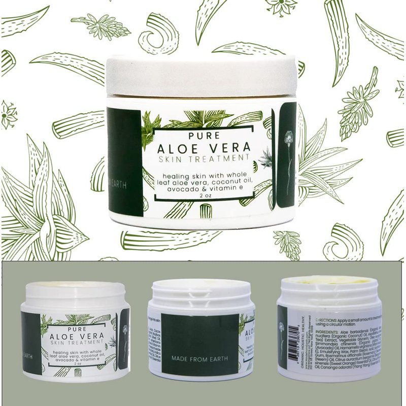 The Pure Aloe Vera Skin Treatment contains organic aloe vera straight from the leaf. Contains organic herbs and plant extracts with moisturizing and soothing properties. This ultra-hydrating cream heals damaged skin caused by sun burn, eczema, psoriasis and other dry skin conditions.