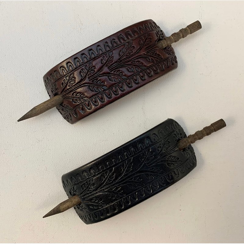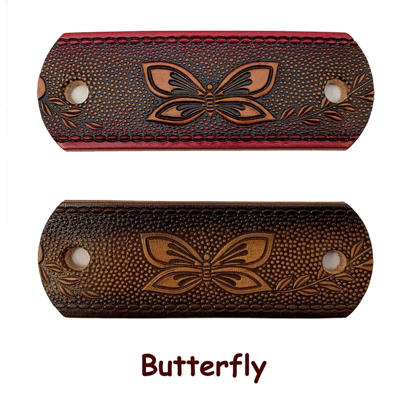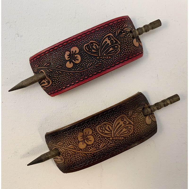 These butterfly pattern barrettes are hand made in Mooresville, Indiana, USA. I have been crafting heavy-duty leather barrettes for over 40 years now. The photos represent the color choices, but please understand that leather is a natural substance and each barrette will be unique. Each piece of leather will take the dye in its own way, and therefore there will be some variations of the colors. The barrette is 1 1/2" to 1 3/4" tall and 4 1/4” wide. The centers of the holes are 3 1/4" apart. The barrette sticks are made of lathe-turned hardwood, very sturdy and finished in an attractive dark stain.We so often hear, "Oh, I can't wear those. My hair is too thin." Or, "Oh, I can't wear those. My hair is too thick." NOT TRUE!! If your hair is long enough for a ponytail, you can wear our barrettes. Just put your hair up in an elastic hair band. Then add the barrette by spearing the stick above the hairband. You do not have to surround all of your hair and the barrette can't slip off because it is trapped above the hair band. If you want to put your hair up in a bun, put it in a ponytail first. Then twist your hair up and add the barrette.