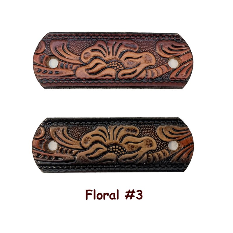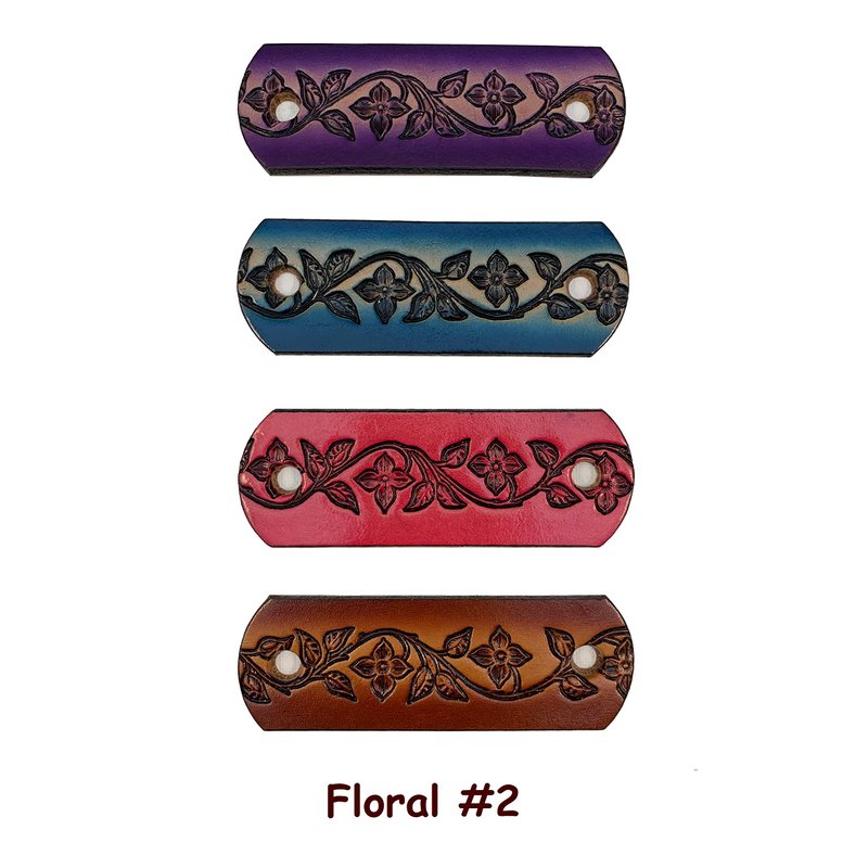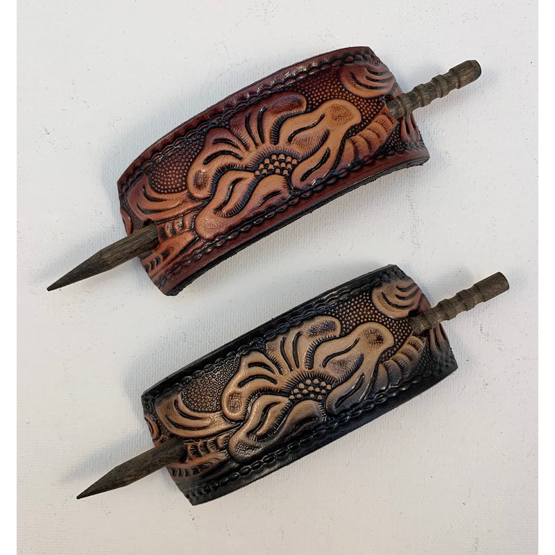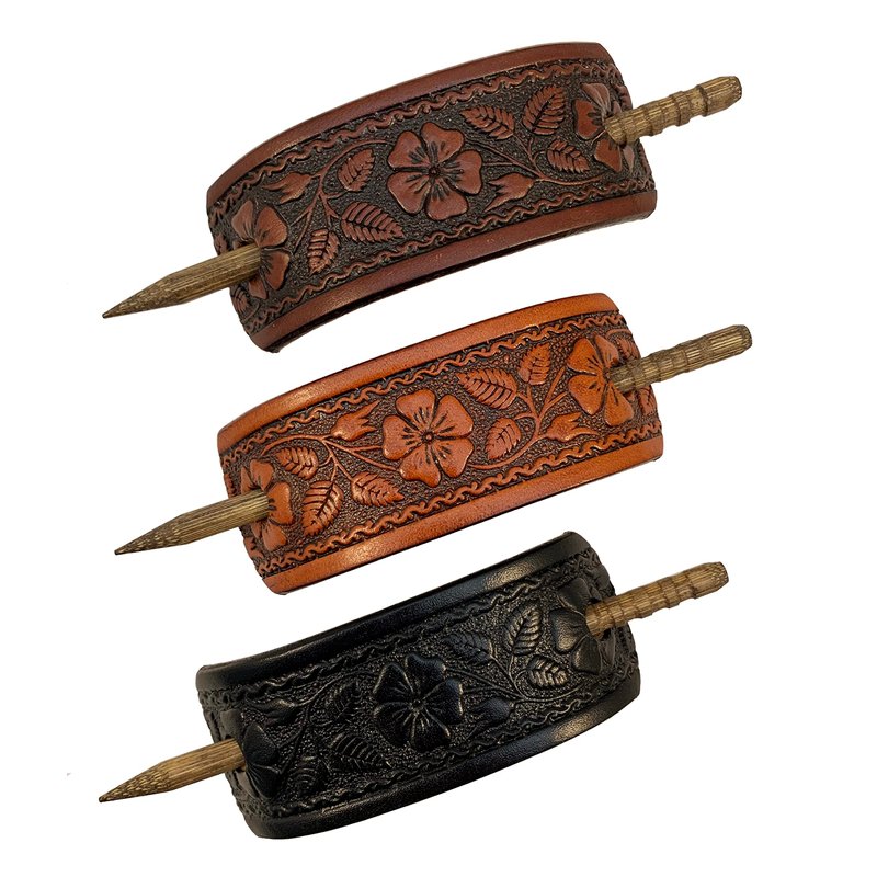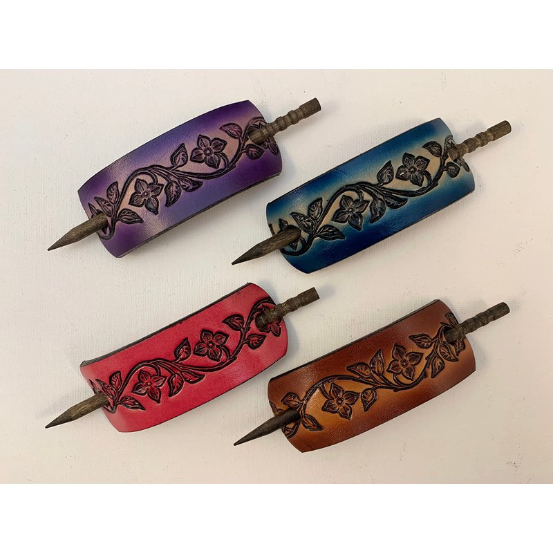 These floral pattern barrettes are hand made in Mooresville, Indiana, USA. I have been crafting heavy-duty leather barrettes for over 40 years now. The photos represent the color choices, but please understand that leather is a natural substance and each barrette will be unique. Each piece of leather will take the dye in its own way, and therefore there will be some variations of the colors. The flower barrette is 1 1/2" to 1 3/4" tall and 4 1/4” wide. The centers of the holes are 3 1/4" apart. The barrette sticks are made of lathe-turned hardwood, very sturdy and finished in an attractive dark stain.We so often hear, "Oh, I can't wear those. My hair is too thin." Or, "Oh, I can't wear those. My hair is too thick." NOT TRUE!! If your hair is long enough for a ponytail, you can wear our barrettes. Just put your hair up in an elastic hair band. Then add the barrette by spearing the stick above the hairband. You do not have to surround all of your hair and the barrette can't slip off because it is trapped above the hair band. If you want to put your hair up in a bun, put it in a ponytail first. Then twist your hair up and add the barrette.