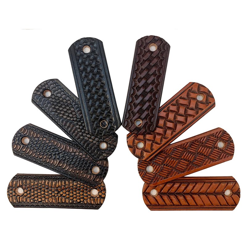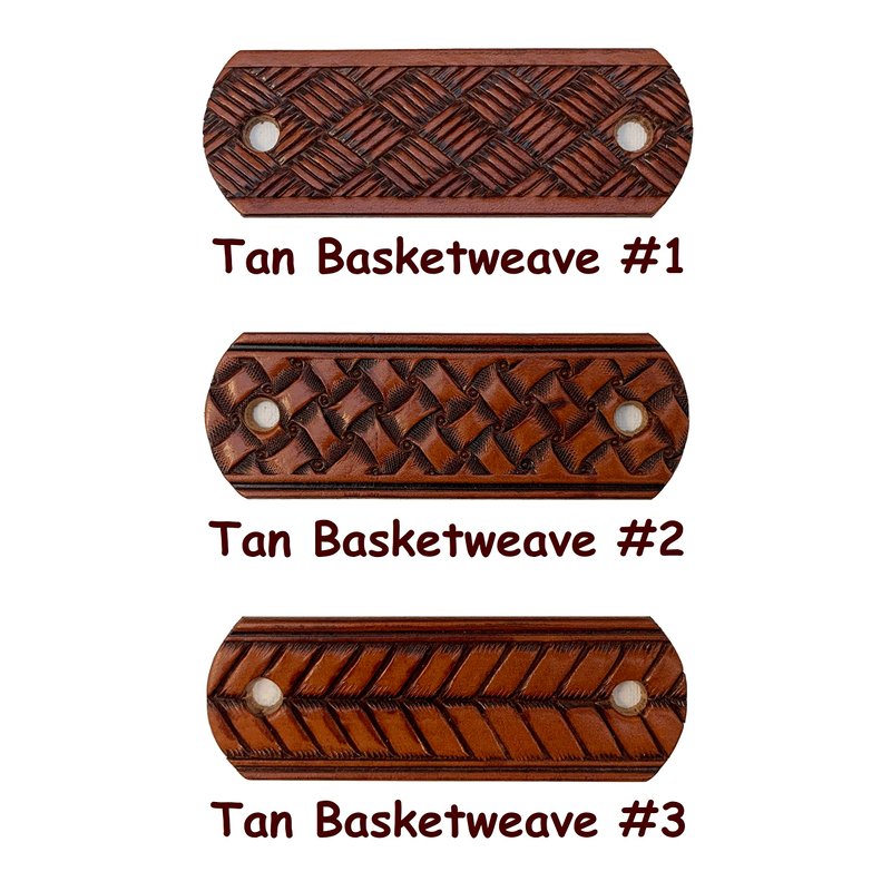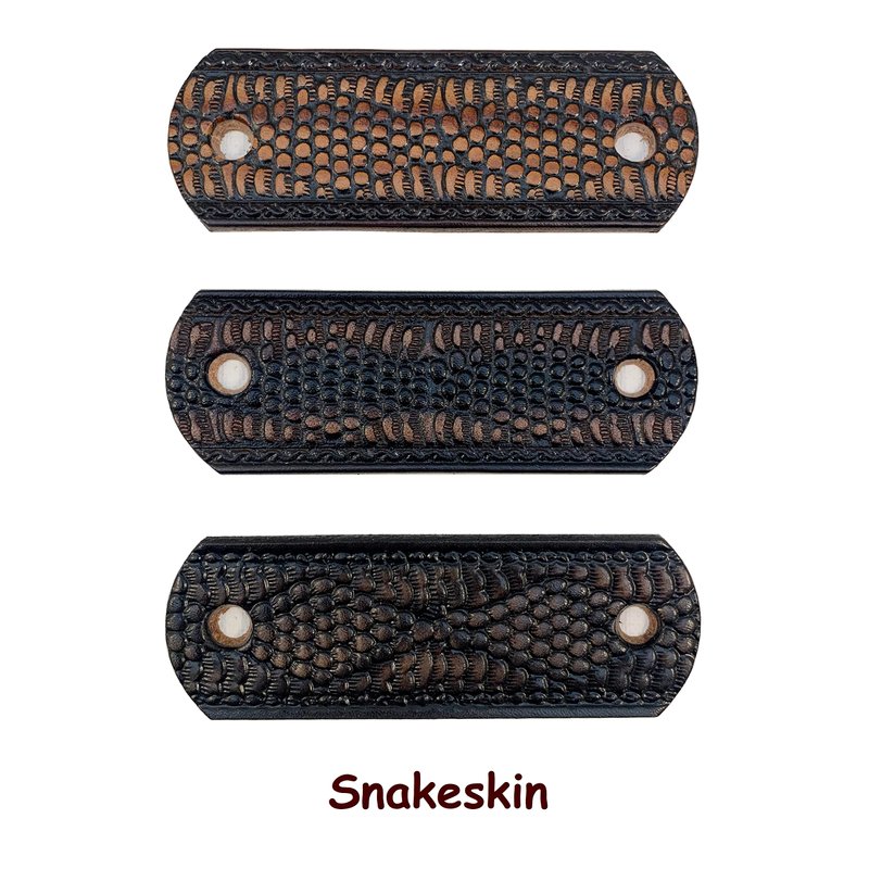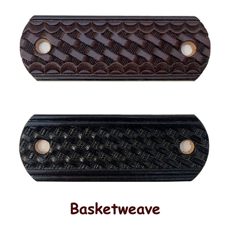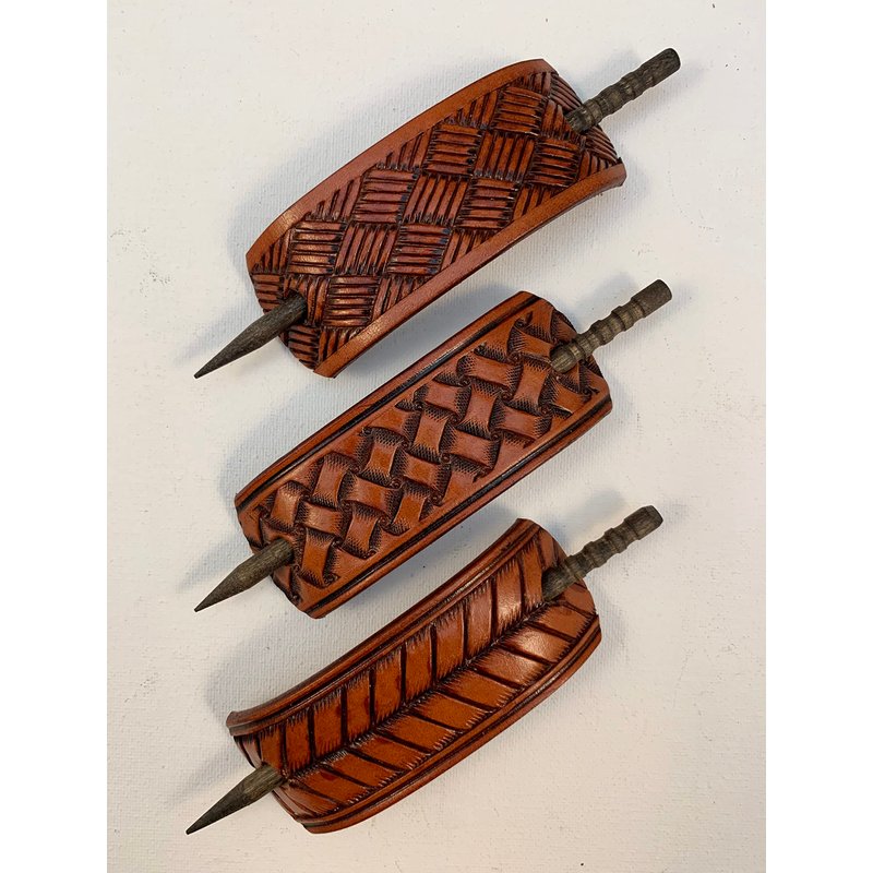 These basketweave and snakeskin pattern barrettes are hand made in Mooresville, Indiana, USA. I have been crafting heavy-duty leather barrettes for over 40 years now. The photos represent the color choices, but please understand that leather is a natural substance and each barrette will be unique. Each piece of leather will take the dye in its own way, and therefore there will be some variations of the colors. The barrette is 1 1/2" to 1 3/4" tall and 4 1/4” wide. The centers of the holes are 3 1/4" apart. The barrette sticks are made of lathe-turned hardwood, very sturdy and finished in an attractive dark stain.We so often hear, "Oh, I can't wear those. My hair is too thin." Or, "Oh, I can't wear those. My hair is too thick." NOT TRUE!! If your hair is long enough for a ponytail, you can wear our barrettes. Just put your hair up in an elastic hair band. Then add the barrette by spearing the stick above the hairband. You do not have to surround all of your hair and the barrette can't slip off because it is trapped above the hair band. If you want to put your hair up in a bun, put it in a ponytail first. Then twist your hair up and add the barrette.