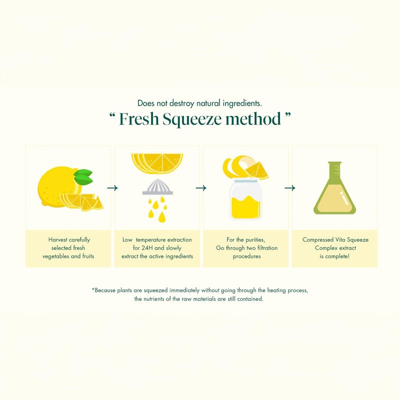 - VITA SQUEEZE COMPLEX: It is rich in hydration vitamins from fresh fruits and vegetables, using the "vita squeeze method ". An environmentally friendly extraction method that resembles nature, without artificial forces