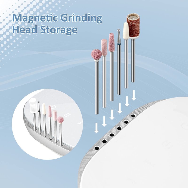 - 3/32" Nail Drill Bits: This e-file nail drill includes 6 sanding bands and 6 different metal drill bits packed in a storage box. The magnetic drill holder on the top of the machine makes it easier for you to pick up and temporarily store bits.