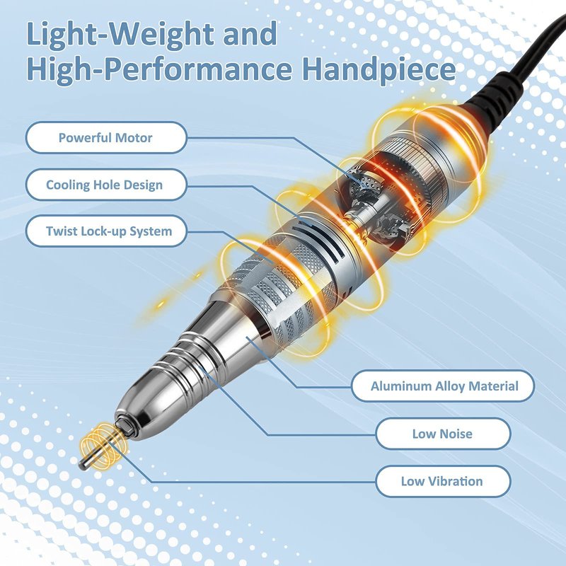 - High-performance Handpiece: Aluminum alloy material makes it lighter and enables heat to dissipate faster. Twisting lock-up system makes it easier to replace bits. Cooling hole design helps it to dissipate heat efficiently.