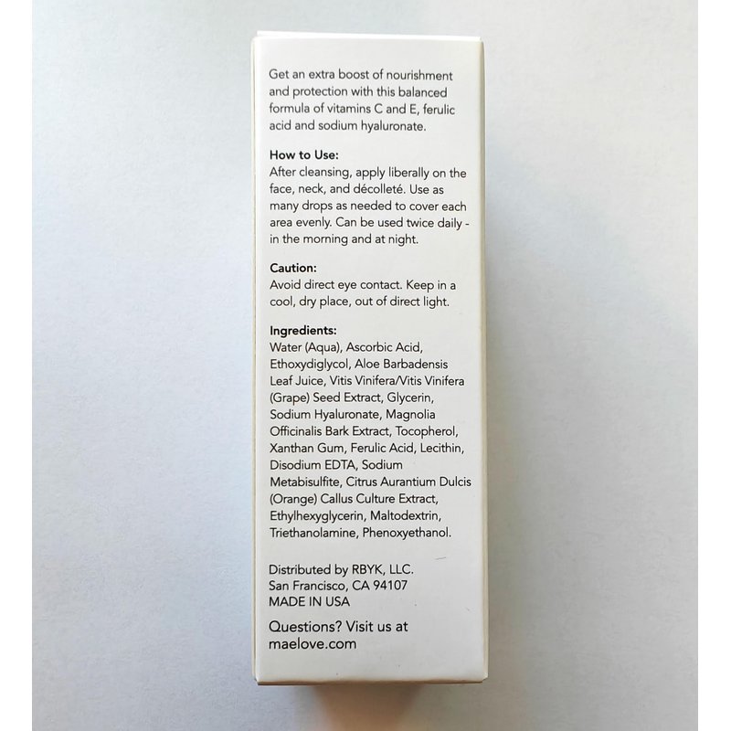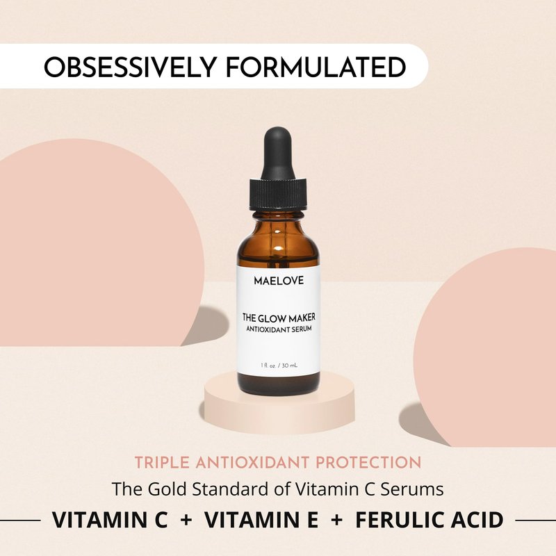 Maelove’s best-selling The Glow Maker Vitamin C Serum uses a powerful and proven blend of 15% L-ascorbic acid (the most effective form of vitamin C) along with vitamin E and ferulic acid. Together, these ingredients reduce fine lines, even skin tone, protect against UV damage, and enhance your natural glow. Celebrated as a top vitamin C serum in the Strategist’s Beauty 100 awards, vitamin C is a must-have in your skincare routine to fight damage from the harmful UV rays which causes skin aging. This expertly stabilized antioxidant blend also includes vitamin E and Ferulic Acid to help reduce dark spots, even out skin tone, and brighten the overall complexion. We took the formula one-step further by adding a touch of hyaluronic acid and our proprietary botanical blend (Vitis Vinifera, Aloe, Aurantium Dulcis and Magnolia) to create an extra nourishing serum. The thin texture allows for quick absorption and easy application of other serums, creams, and makeup on top. Proudly researched and manufactured in the USA, Maelove products are obsessively formulated to work well for sensitive skin. Our Glow Maker is oil-free, gluten-free, non-comedogenic, and free of parabens, phthalates, triclosan, dyes, and artificial fragrances. Make it a part of your daily routine and watch your skin become brighter, youthful, and glowing.
