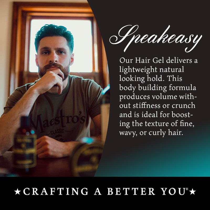 Maestro’s Classic Speakeasy Blend Hair Gel delivers a lightweight natural looking hold. This body building formula produces volume without stiffness or crunch and is ideal for boosting the texture of fine, wavy, or curly hair. Its Undeniably Good.