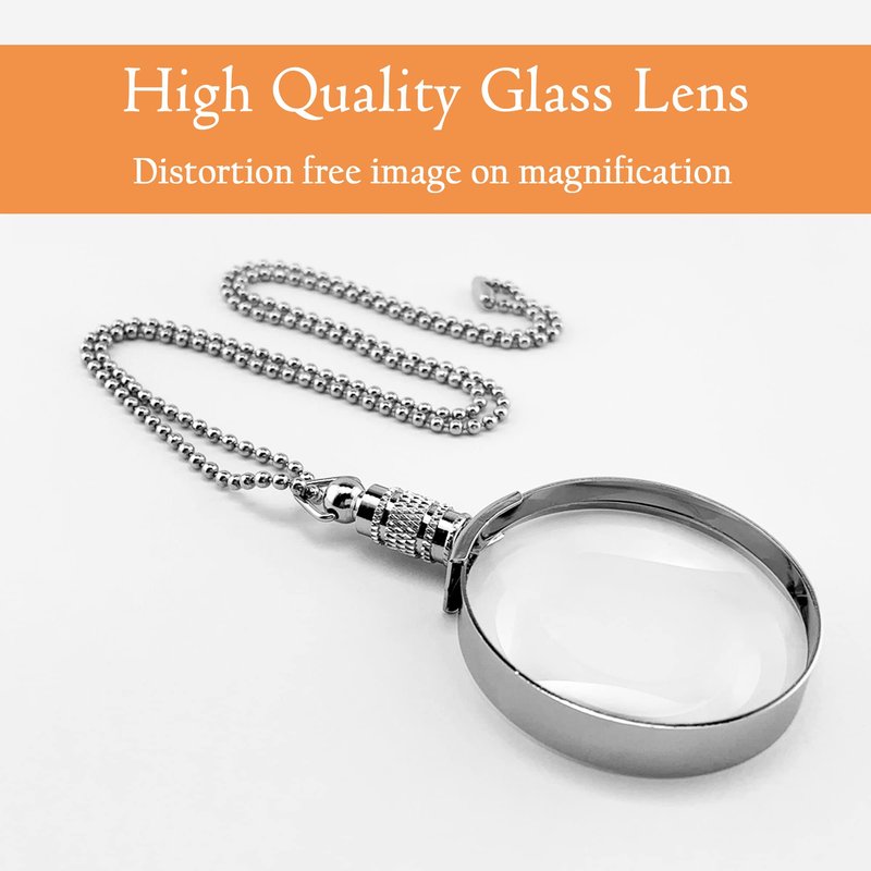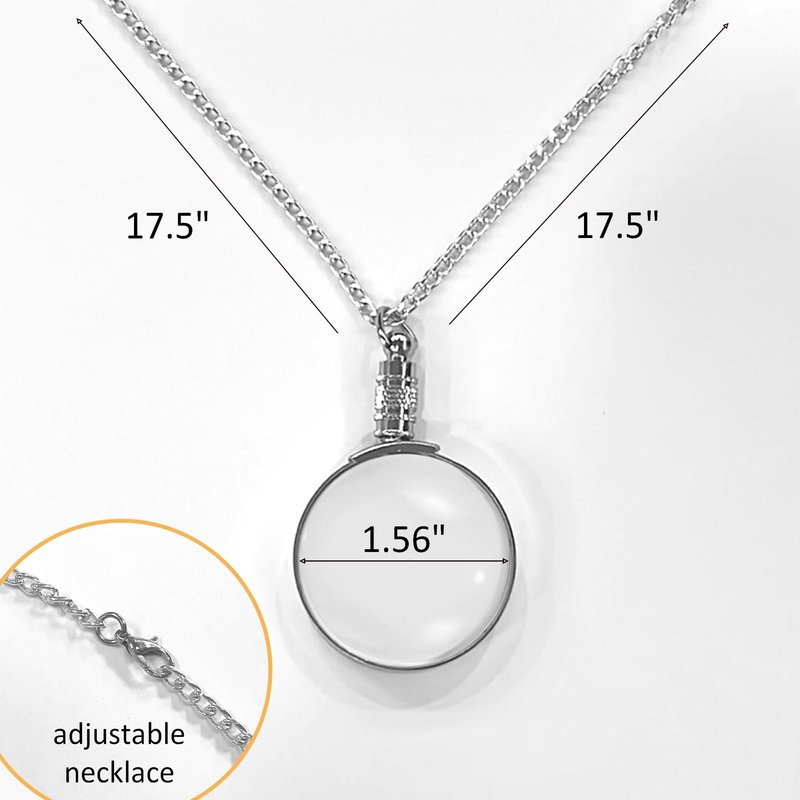- ✅3X MAGNIFICATION: Dia. 1.5" magnifying glass with 17" - 18" matching zinc alloy with silver plated necklace chain.