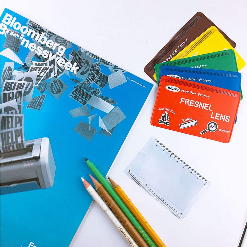 MagDepo 6 Pack Credit Card Size Magnifier Ruler Fresnel Lens Fire Starter Compact Plastic Magnifying Lens Wallet Pocket Magnifier for Reading Small Print, Maps, and Books -Red