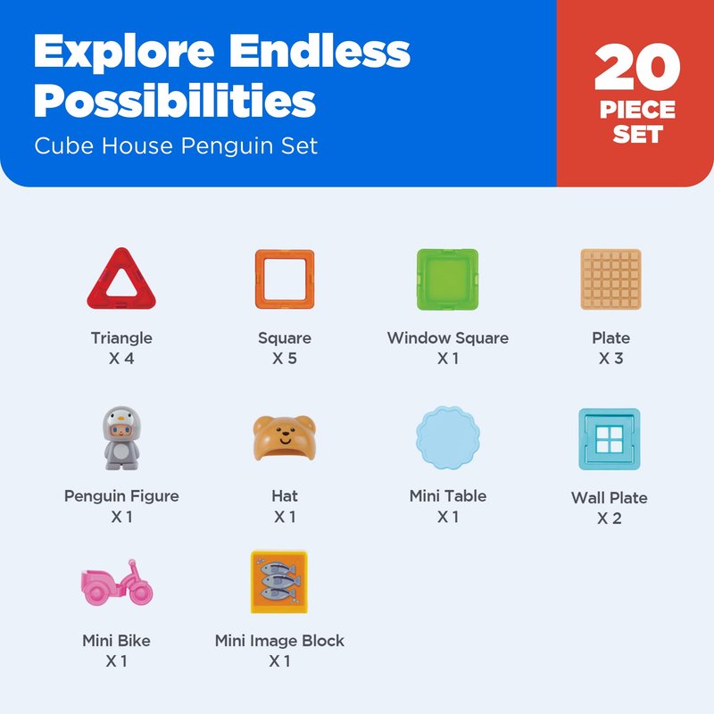 Magformers Magnetic Tiles are magnetic construction toy sets that let children click together colorful geometric shapes to build endless creations. The Magformers Penguin House 20Pc set allows you to build themed houses using squares, triangles, and accessories. It includes 4 triangles, 5 squares, 1 window square, 3 plates, 2 wall plates, 1 mini bike, 1 fish block, 1 penguin character, 1 bear hat, and 1 mini table. The always-attracting magnetic blocks ensure pieces click together securely for durable structures and can be neatly stacked for storage. Suitable for ages 3+, Magformers aids skill development as STEM.org authenticates it for seamlessly integrating into STEM education at home or at school. These stem magnetic tiles are evaluated to align with science/math standards and 21st-century skills. Magformers magnetic building tiles promote critical thinking, creativity, problem-solving, and collaboration. This engages young minds through sensory stimulation and kinesthetic learning.