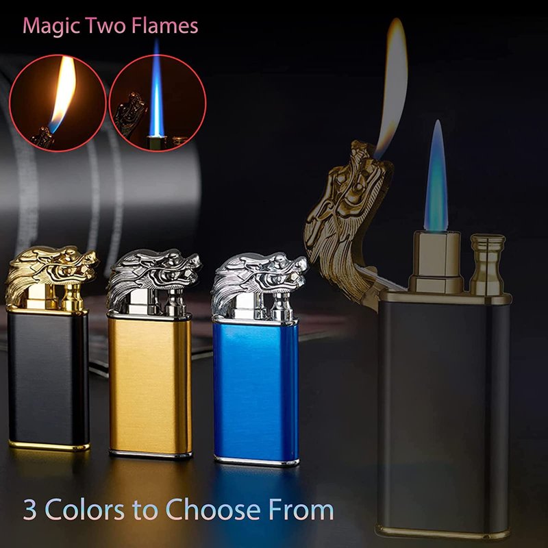 - 【Exquisite Dragon Design】Ergonomic design provides comfort to your hand and protects your fingers from being burned. Soft flame straight flame, double fire design, one lighter, enjoy two ways of lighting,The shell is comfortable to the touch. Prefect gift to your father or boyfriend.