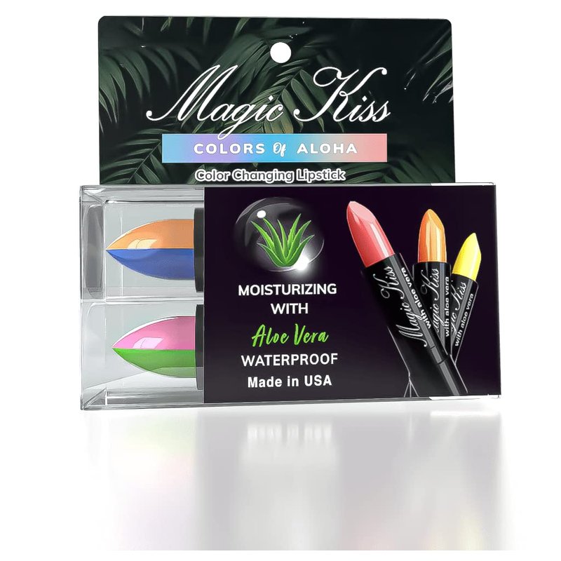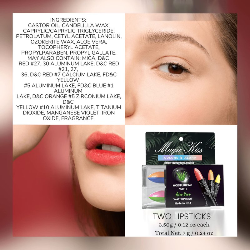 Magic Kiss Lipstick is available in many colors and when applied to your lips will change to a Beautiful shade of Red or Pink depending on your skin temperature, humidity and pH. Magic Kiss Lipstick is waterproof and will not easily rub off after application.