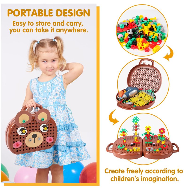 - 【Develop STEM Skills】Drill mosaic set perfect for giving your little engineer a jump in STEM skills! Each kids drill and screw set maxes out their spatial awareness, logical problem solving, visualizing & planning, fine motor skills & hundreds of other essential cognitive skills through play with STEM building toys