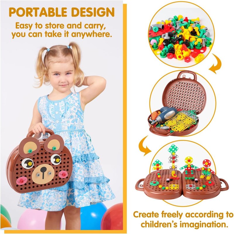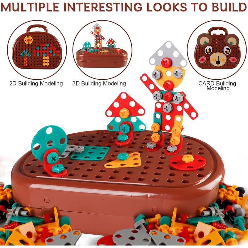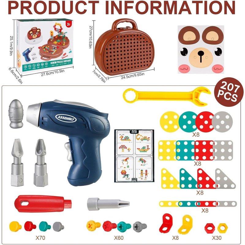 - đ ď¸ăCreative Mosaic Design Puzzle Set ăThe 205 PCS drill and screw set combines education and play, allowing children to explore the principles of construction engineering while playing. Use a drill and screwdriver to design and build your own imaginary model by combining screws and nuts.