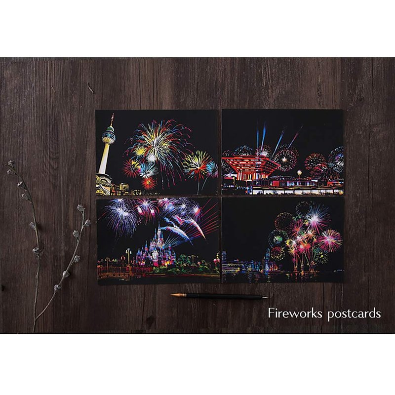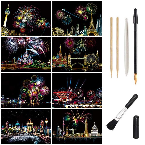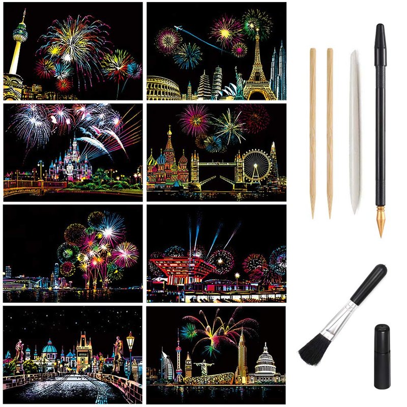 Magic Scratch Art Paper, Mini Envelope Postcard, Rainbow Night View Scratchboard for Adults and Kids, Art & Crafts Set: 8 Sheets Scratch Cards & 6 Tools Drawing Pen, Clean Brush (Gorgeous Fireworks)