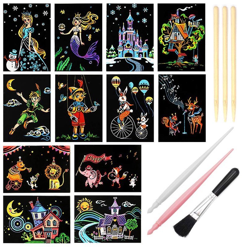- [ PACKAGE INCLUDING ] : 12 x Sheets Scratch Cards(Princess/ Pinocchio/Castle/Animal), 2 x Scratch Pen, 1x Clean Brush, 3 x Wood Stylus Stick - 7.9 x 5.5 inch