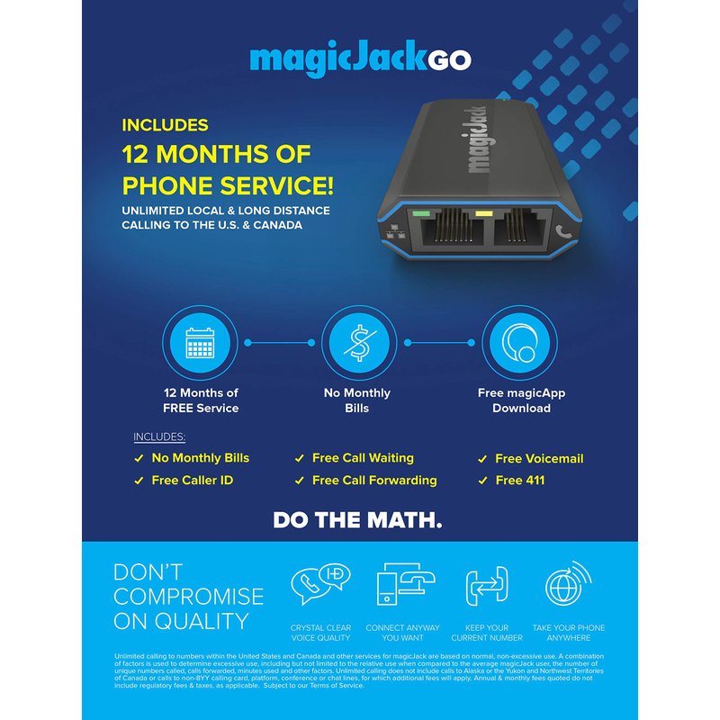 - EASY TO SET UP: Use with or without a computer, simply connect your magicJackGO to your existing high speed internet and any cordless or Landline home phone. Step-by-step instructions included. Includes Power adapter, Ethernet cord and USB extension cord. (no international charger included)