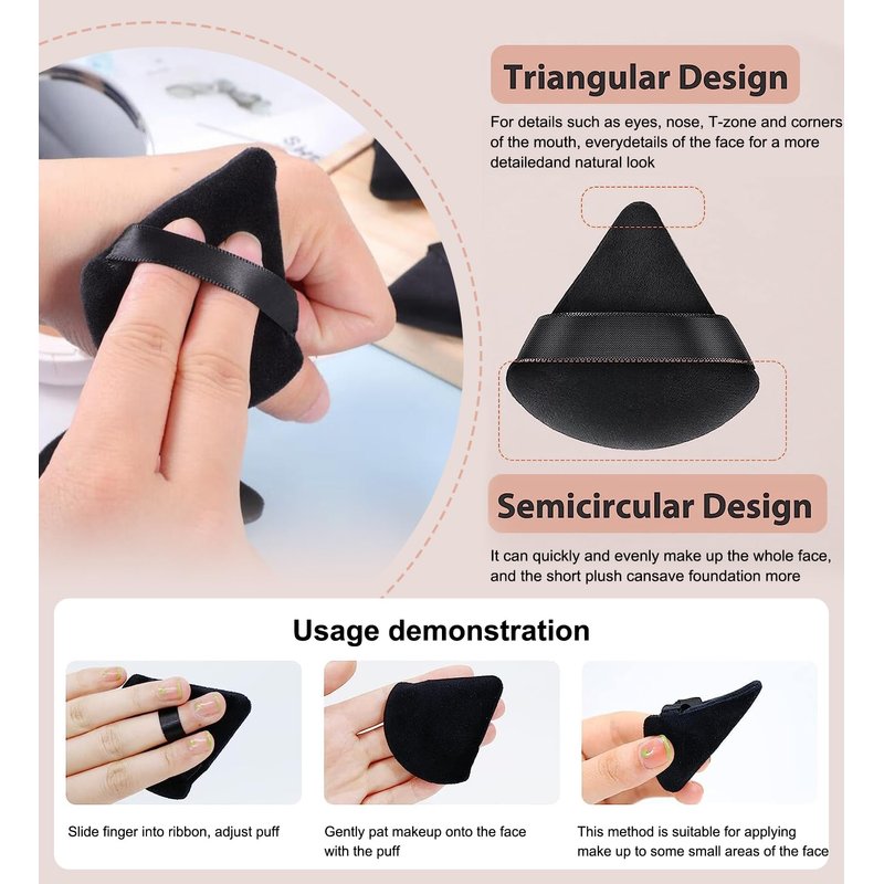 - This Powder puff face triangle are designed with a triangular shape and curved bottom edge. When you place the foundation on your cheeks and forehead you can use the rounded side; when you place the foundation on your eyes and contour lines you can choose the triangular side and you don't have to worry about uneven makeup application.