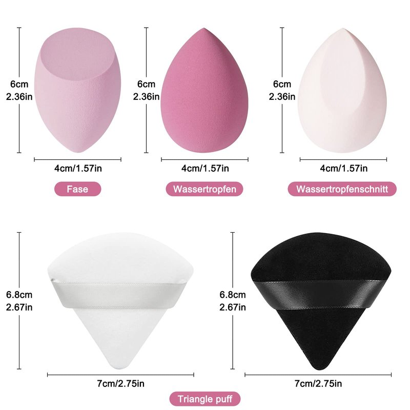 - This make up sponge set contains 4 different drop shapes with macaron-colors and 6 triangular powder puffs, including 3 oblique shapes, 1 drop shape, 1 oblique drop shape, 6 triangular make up face powder puffs.